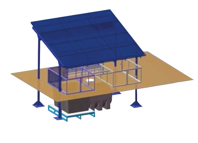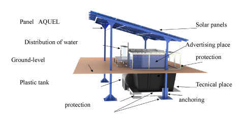 The whole filtration technology including the control unit and the standby charging batteries is installed in a solid plastic container with lockable lid, intended for emplacement under the ground at the depth of about 1.5 metres, in compliance with your requisites. All components (fi ltration system, R.O. system, UVC steriliser, converter, solar batteries) are fastened by means of stainless and aluminium supports and holders, including hydraulic and electric connections.